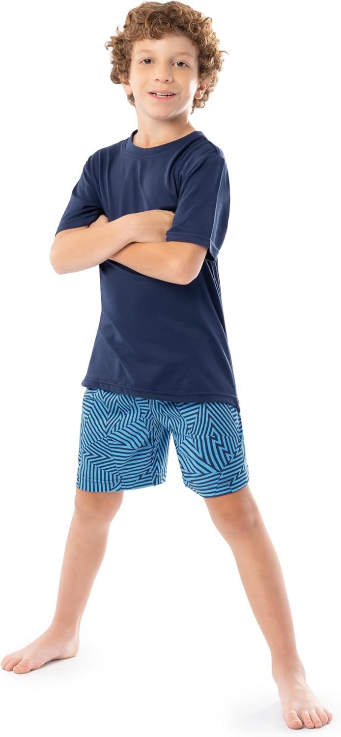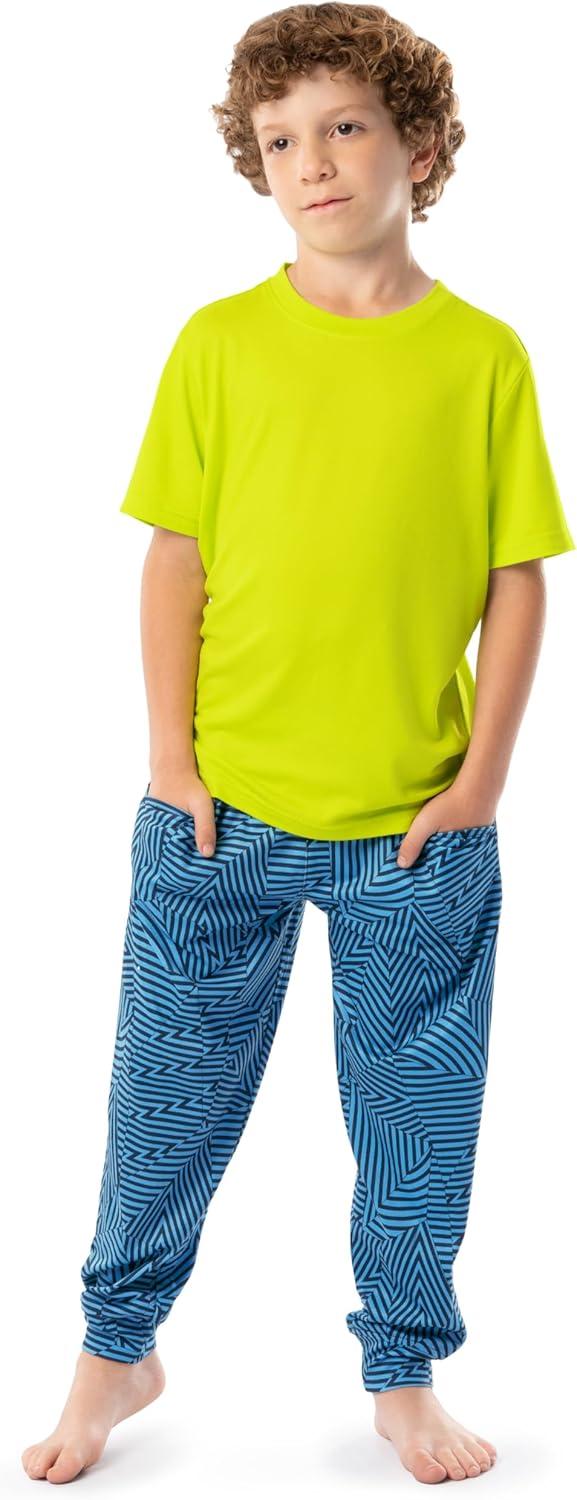 The Fruit of the Loom Boys' Loose Fit 4-Piece Sleep Set offers all-season versatility and comfort. This set includes a crewneck top, logo elastic waistband jogger pants, and shorts, ensuring a perfect mix for warmer or cooler nights. Made from soft and durable jersey fabric, it provides a cozy, breathable feel, while the pants feature convenient side seam pockets. Designed with a loose fit and added stretch, these pajamas allow unrestricted movement, making bedtime or lounging more enjoyable for your little one.