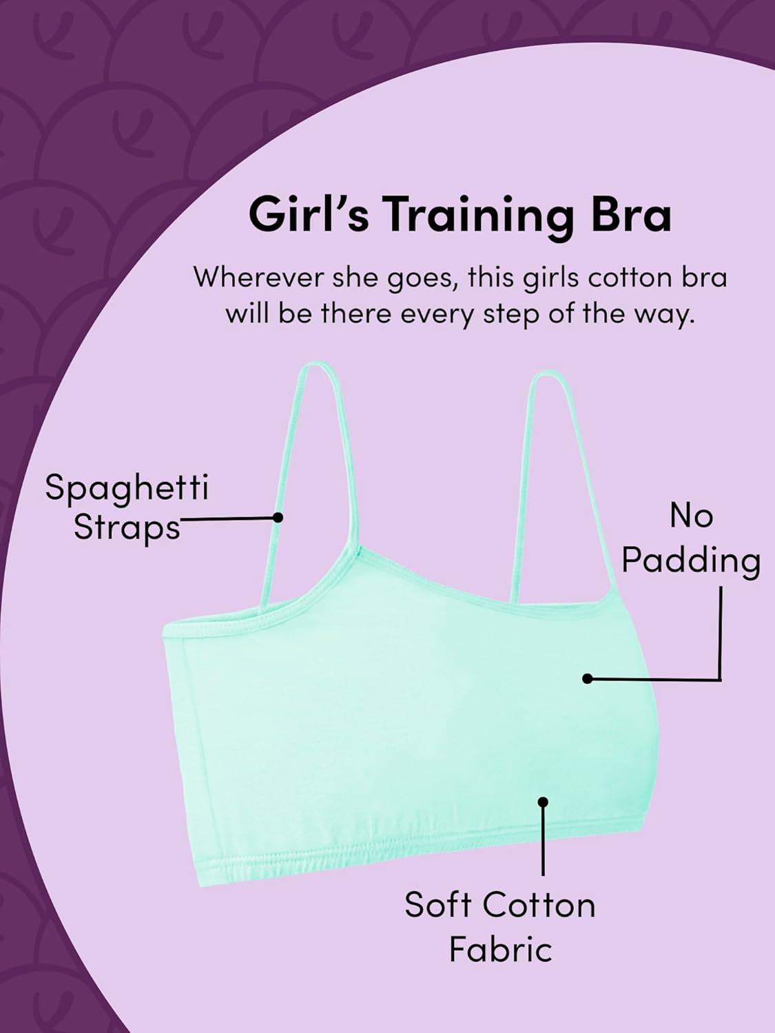 Soon to be your girl’s favorite first bra. Wherever she goes, these girls cotton bras will be there every step of the way. The Fruit of the Loom Girl’s Cotton Training Bras include four beginner bras in a variety of cute colors and prints, making it fun for her to get dressed in the morning. These training bras are made of soft, breathable cotton fabric for comfortable and lightweight support. The cami bras have an easy pullover style that won’t slow her down. These girls training bras have spaghetti straps and an elastic bottom band to keep her in place throughout the day.