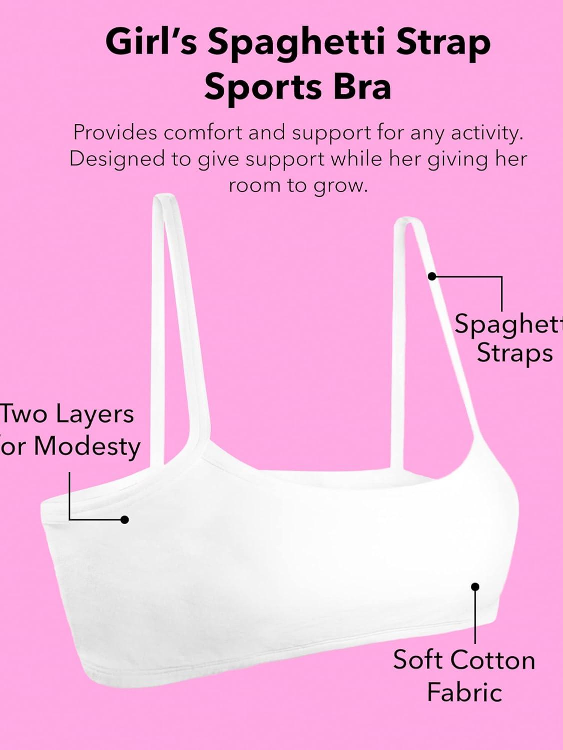 Fruit of the Loom girls' spaghetti strap sport bras provide comfort and support for any activity. The cotton and lycra materials give them a soft feel and also make them machine-washable. Give the girl in your life a good start with Fruit of the Loom. Designed to give her support while giving her room to grow, tried and true Fruit of the Loom underclothes are the perfect choice for your growing girl