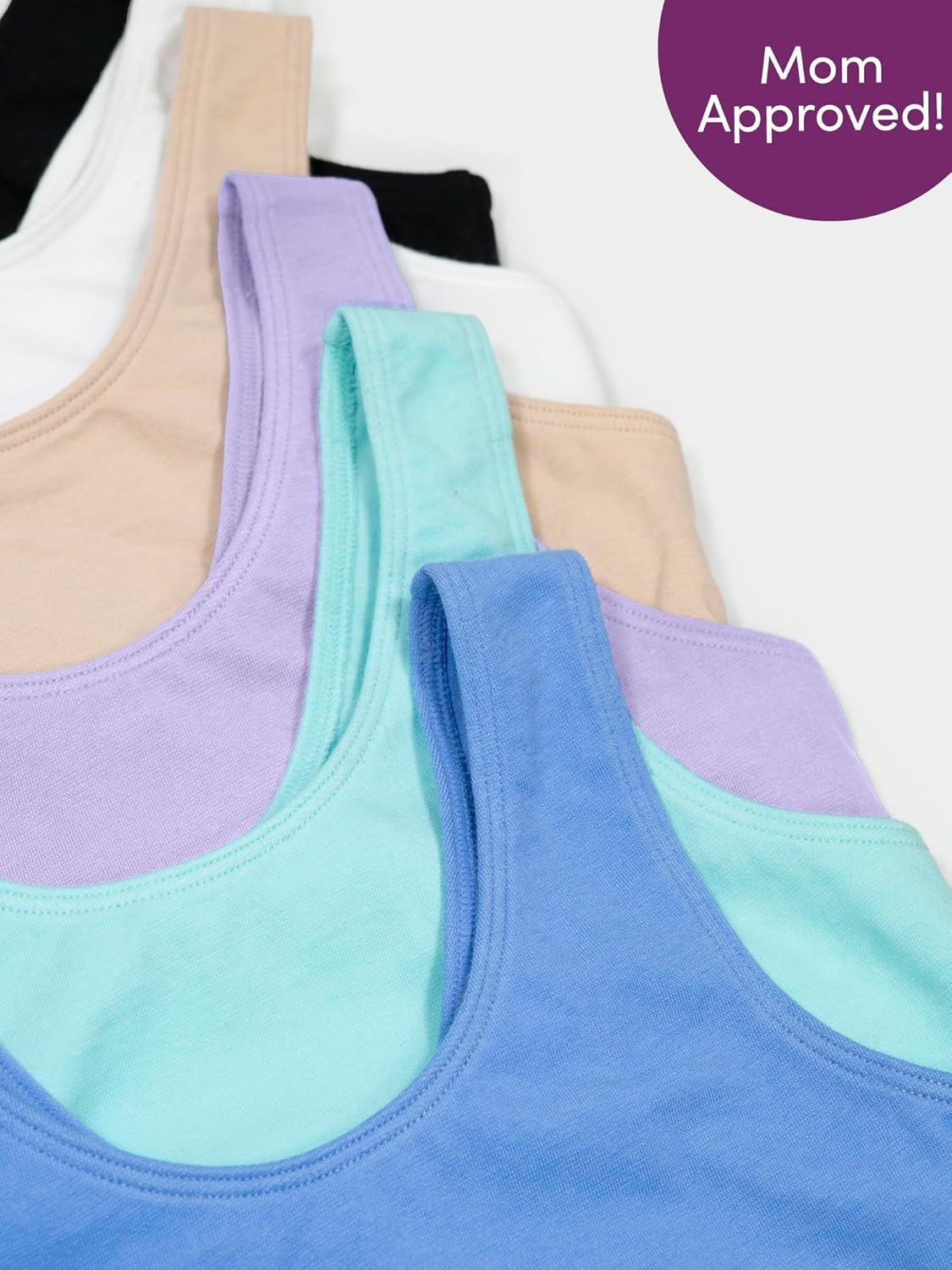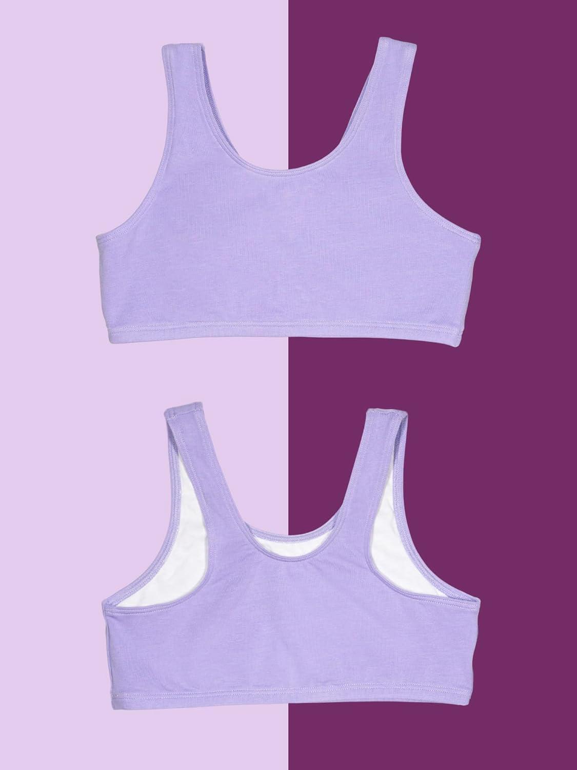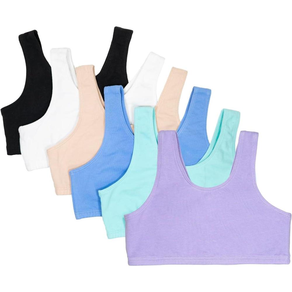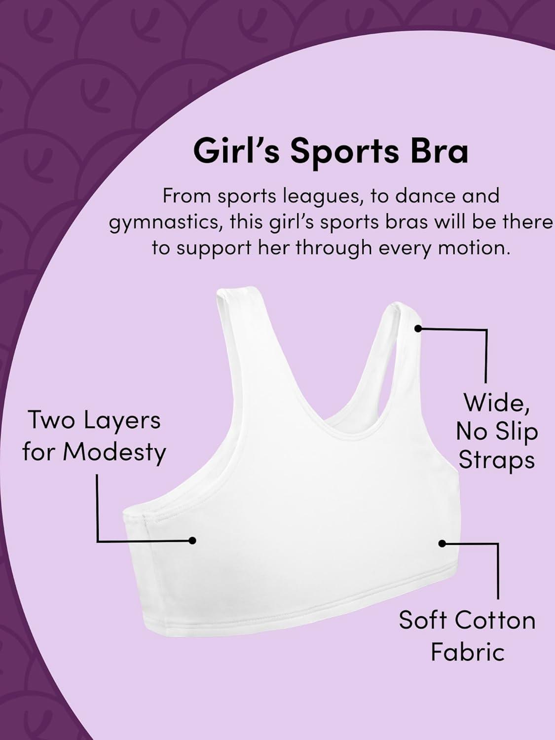 Watch her shine in the Fruit of the Loom Big Girls' Cotton Training Bra From sports leagues to dance and gymnastics, these girl’s sports bras will be there to support her through every motion. The training sports bras are made of soft, stretch cotton fabric in an easy, pullover style. These tween sports bras for girls have a wide elastic bottom band and wider straps that gives her a snug fit to lay underneath clothing. Two ply, soft cotton fabric for modesty. These girl’s sports bras feature a scoop front and back. We know your future fashionista wants to dress herself. Fruit of the Loom Girl's sports bra for girls comes in all of the assorted solid colors & adorable prints so she can pick a fresh look all her own.. Girls training bras 8-10, bra for girls 10-12, girls sports bra 12-14. Give the girl in your life a good start with Fruit of the Loom.