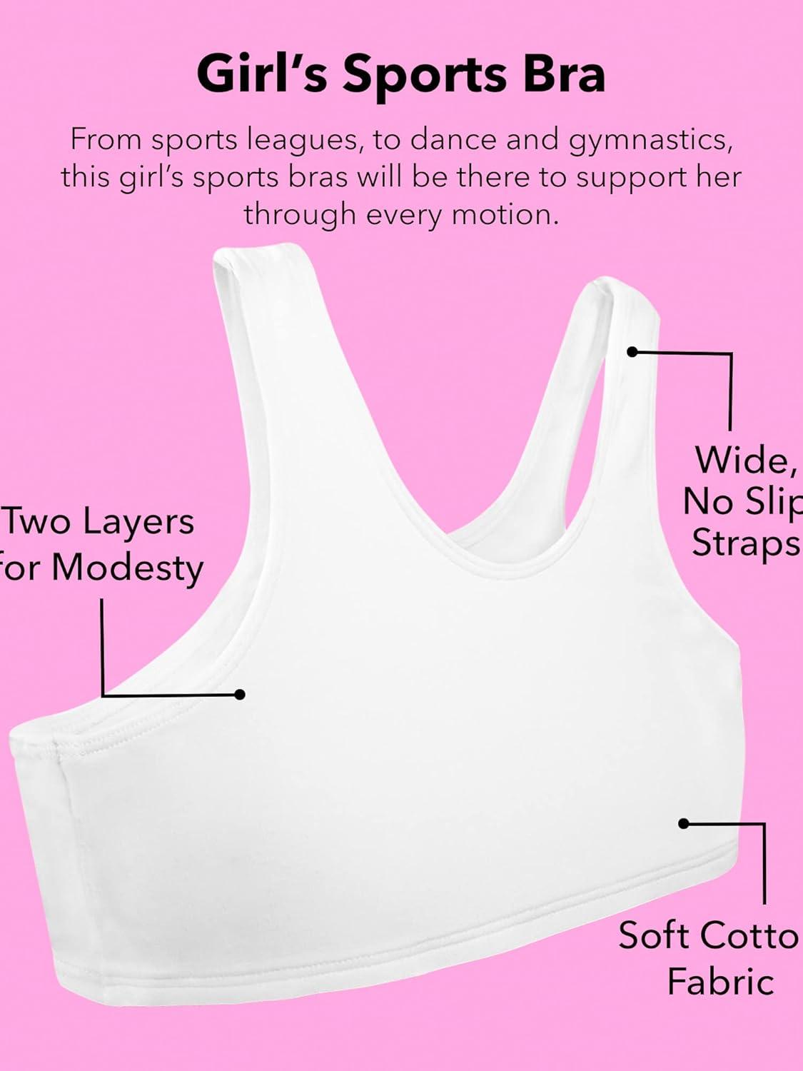 Watch her shine in the Fruit of the Loom Big Girls' Cotton Training Bra From sports leagues to dance and gymnastics, these girl’s sports bras will be there to support her through every motion. The training sports bras are made of soft, stretch cotton fabric in an easy, pullover style. These tween sports bras for girls have a wide elastic bottom band and wider straps that gives her a snug fit to lay underneath clothing. Two ply, soft cotton fabric for modesty. These girl’s sports bras feature a scoop front and back. We know your future fashionista wants to dress herself. Fruit of the Loom Girl's sports bra for girls comes in all of the assorted solid colors & adorable prints so she can pick a fresh look all her own.. Girls training bras 8-10, bra for girls 10-12, girls sports bra 12-14. Give the girl in your life a good start with Fruit of the Loom.
