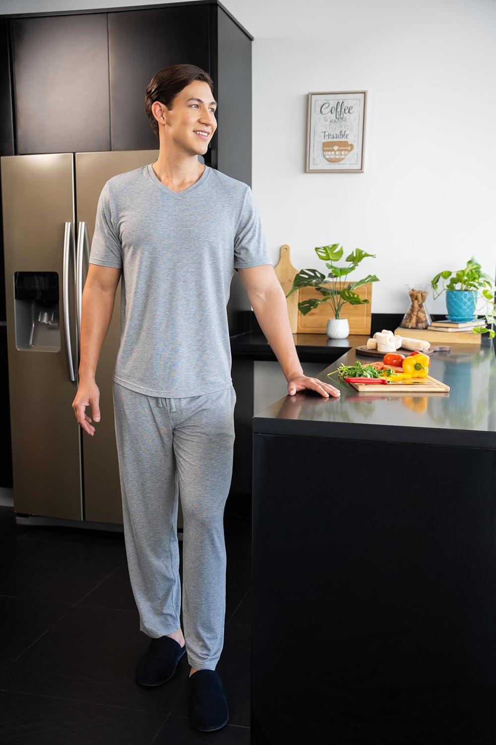 Fruit of the Loom Men’s 360 Stretch Short Sleeve V-Neck Top and Pant Sleep Pajama Set(Grey Heather)