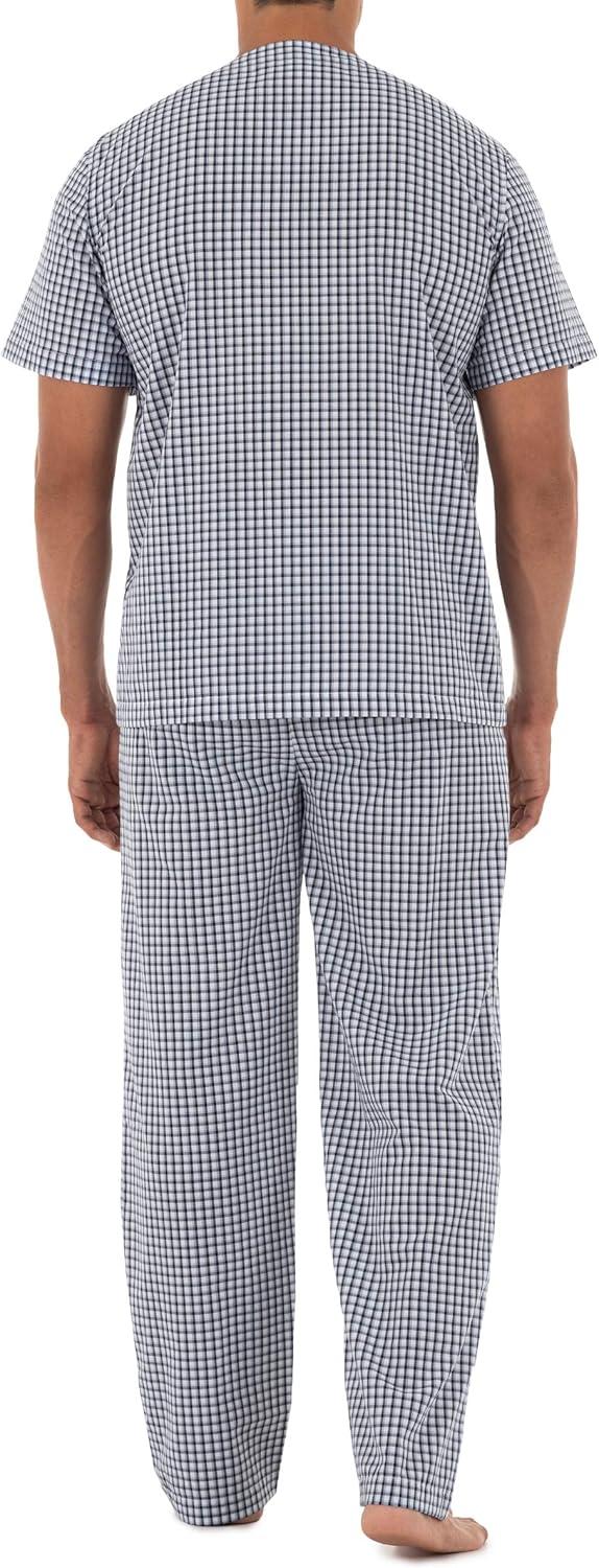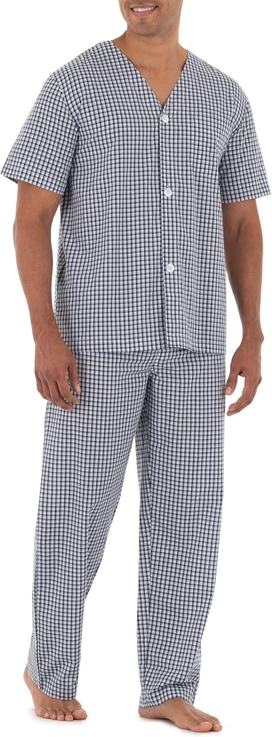 Fruit of the Loom Men’s Broadcloth Short Sleeve Top and Long Pants Pajama Set(Navy/White Check)