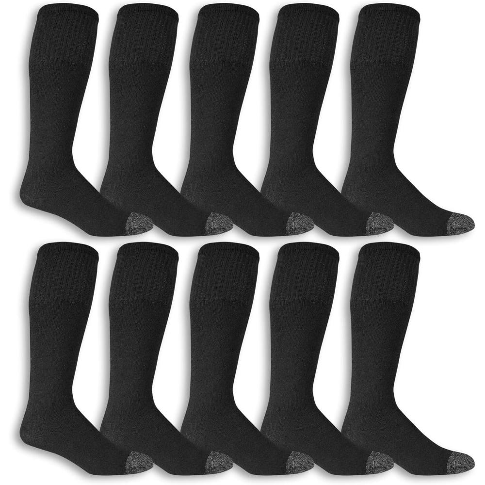 The Fruit of the Loom men's work gear socks are built to withstand the toughest work conditions. The everyday work tube socks are constructed with a soft cotton/polyester blend and full cushioning to maximize comfort in your favorite work boots or shoes. The properties fight the toughest odors on the job, and the reinforced toe provides extra protection in high impact areas so you can outwork them all. Spandex is knitted throughout the sock to deliver the ultimate fit. 10 pairs per package.
