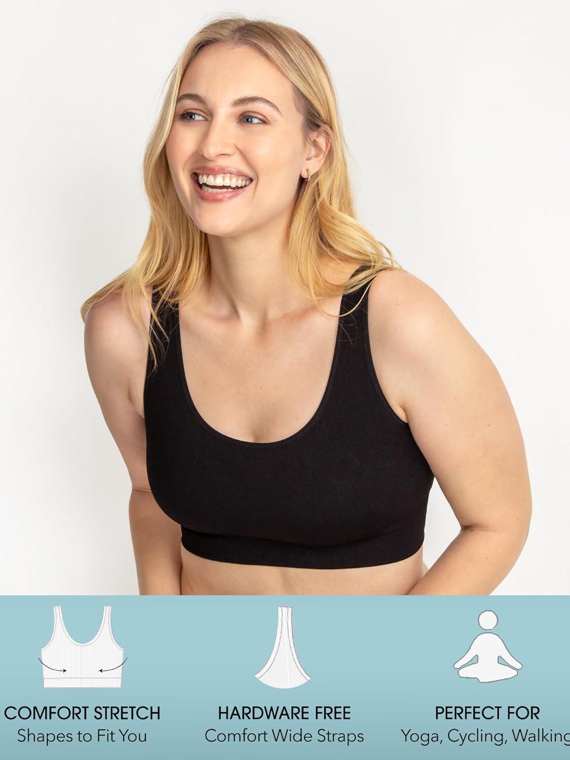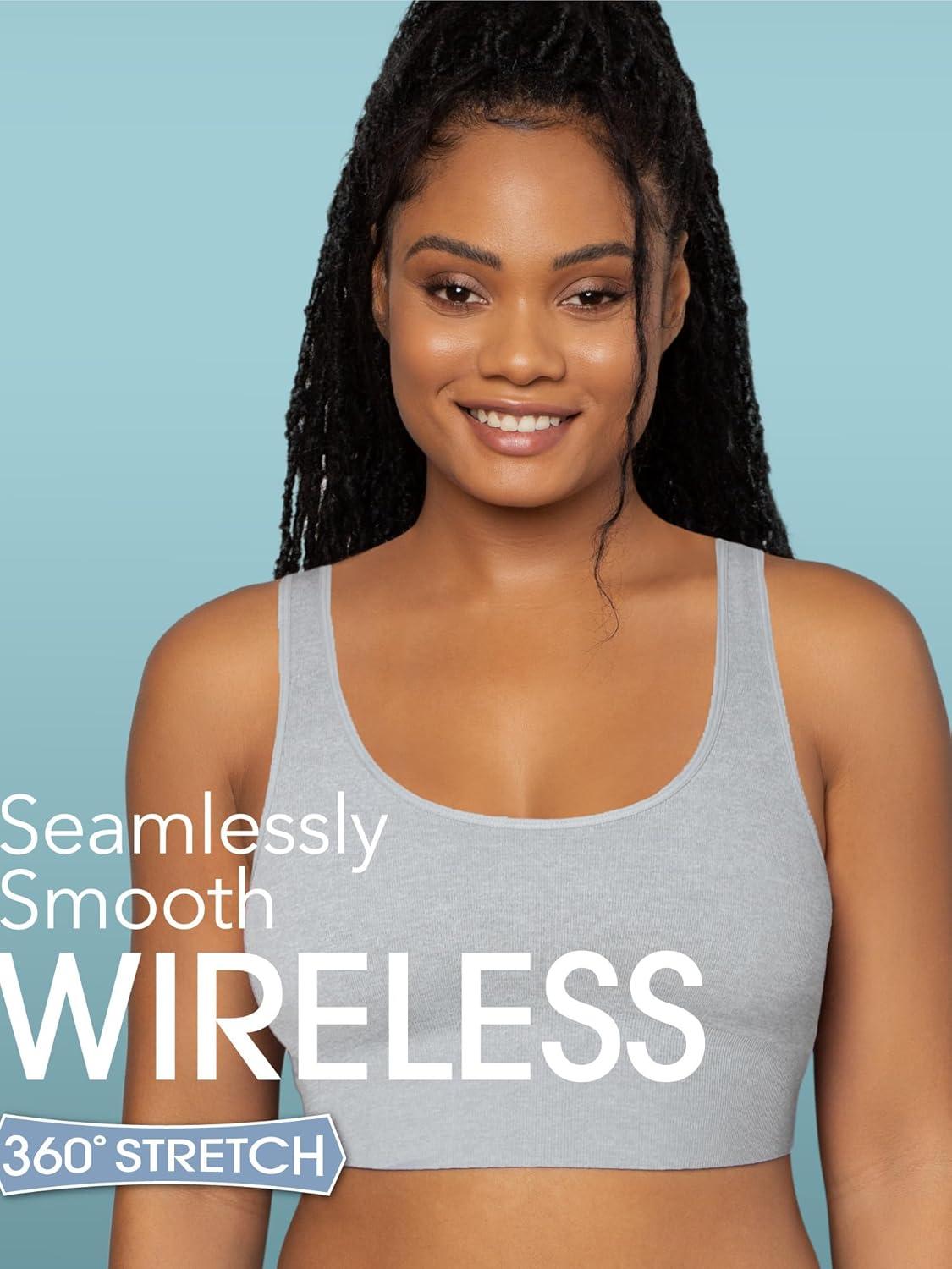 So soft, so comfy, so smooth. The Fruit of the Loom 360 Stretch Seamless Comfort Longline Bralettes are perfect for low/medium activities and even better for everyday wear. Comfort stretch, fabric shapes to fit you. Support comes from the double-lined smoothing, ultra-wide wings and longline design. The perfect under outfit bra, seamless full coverage bra lays flat under your clothes and longline design allows it to double as a top. Bras for women shouldn't be itchy, so we've designed these tag, seam-free and wirefree! Wide comfort straps evenly distribute weight so that they won't dig-in.