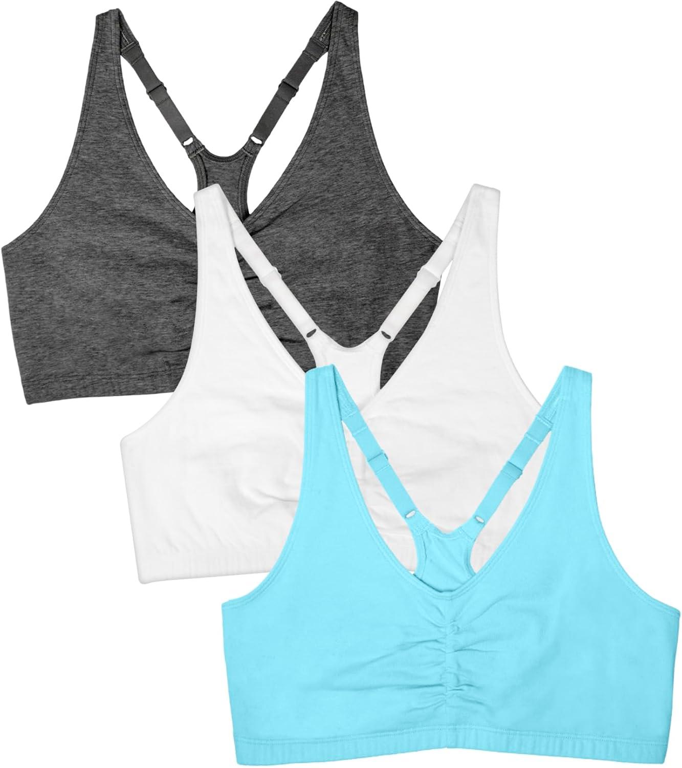 Fruit of the Loom Women’s Adjustable Shirred Front Racerback Sports Bra, Multi Pack Options(Heather Grey/White/Blue Gem)