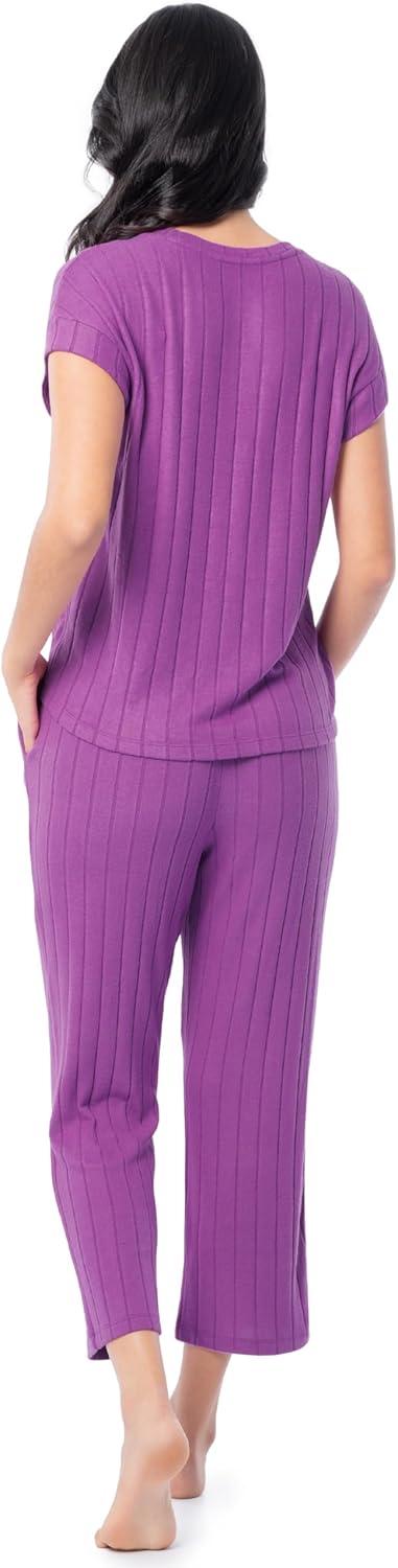 Unwind in style with the Fruit of the Loom Women's Dolman Sleeve and Cropped Pant Sleep Set. This two-piece pajama set is crafted from soft, brushed wide rib fabric that offers a cozy feel and lightweight comfort. Featuring a relaxed dolman sleeve top and straight-leg cropped pants, this set is designed for effortless movement and modern style. The covered elastic waistband ensures a secure fit, while the convenient side pockets add practicality, making it perfect for lounging or a restful night’s sleep.