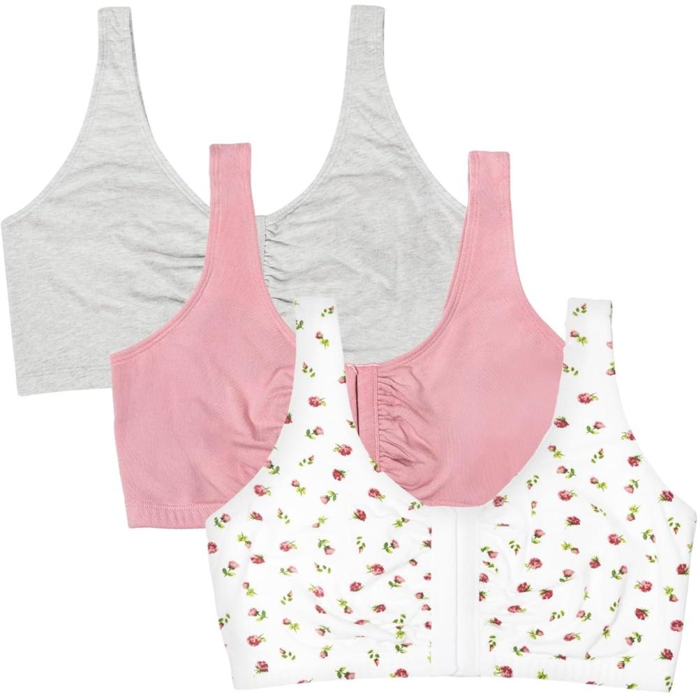 Fruit of the Loom Women's Multi-Pack Front Closure Cotton Bra(Dancing Rosebuds/Lilas/Grey)