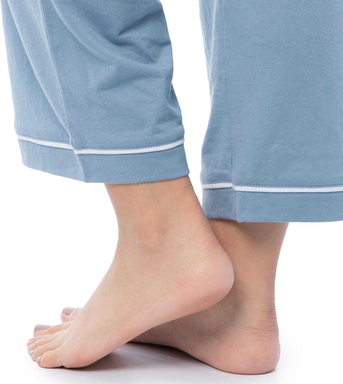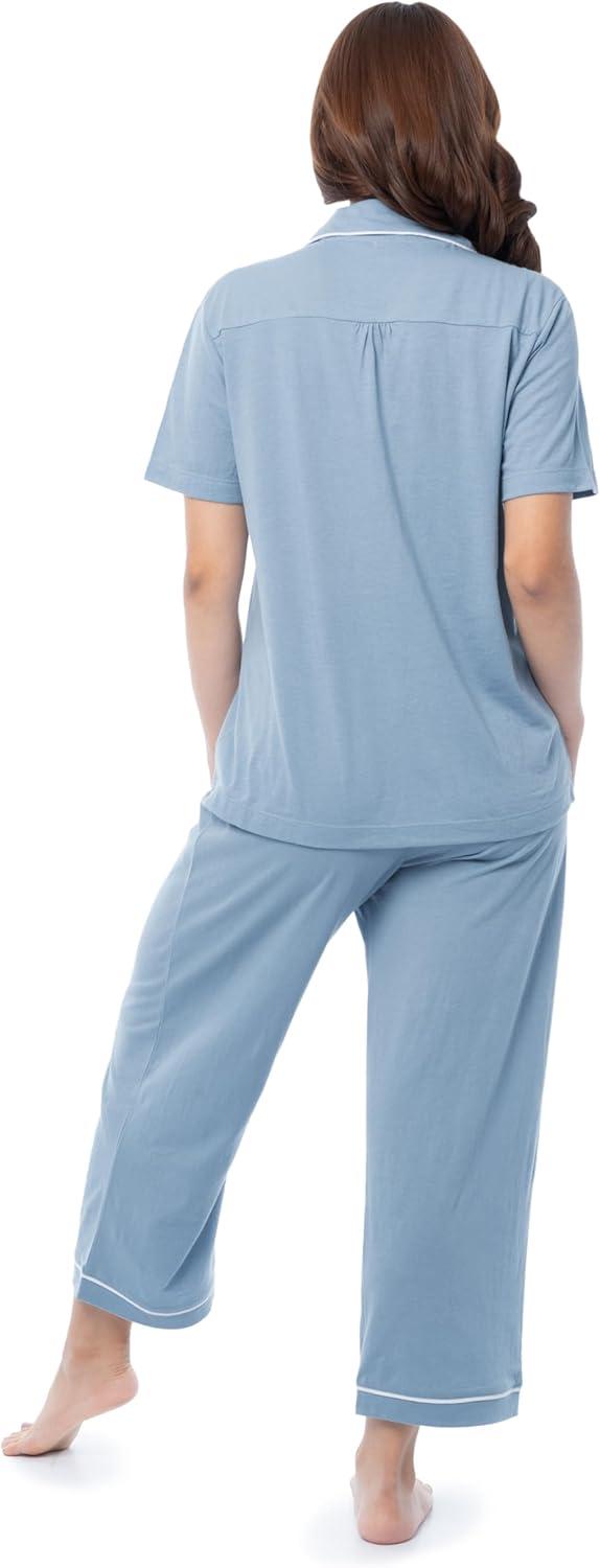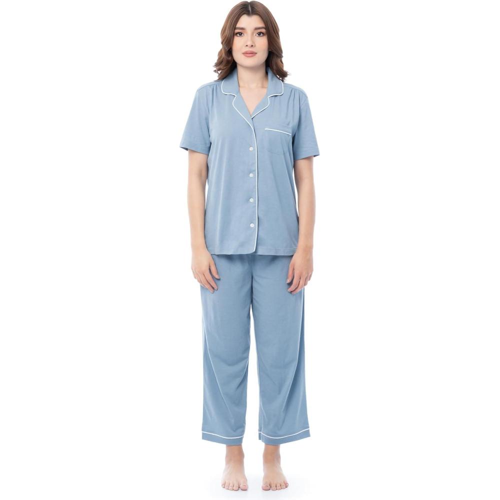 Unwind in ultimate comfort and timeless style with the Fruit of the Loom Women's Piped Button-Down Pajama Set. This two-piece set includes a button-front top with a convenient chest pocket and a relaxed, cropped wide-leg pant. Crafted for maximum comfort, the soft, breathable fabric ensures you stay cozy throughout the night, while the covered elastic waistband provides a secure yet flexible fit. Designed for a smooth, irritation-free experience, this pajama set is perfect for lounging at home or enjoying a peaceful night’s sleep.