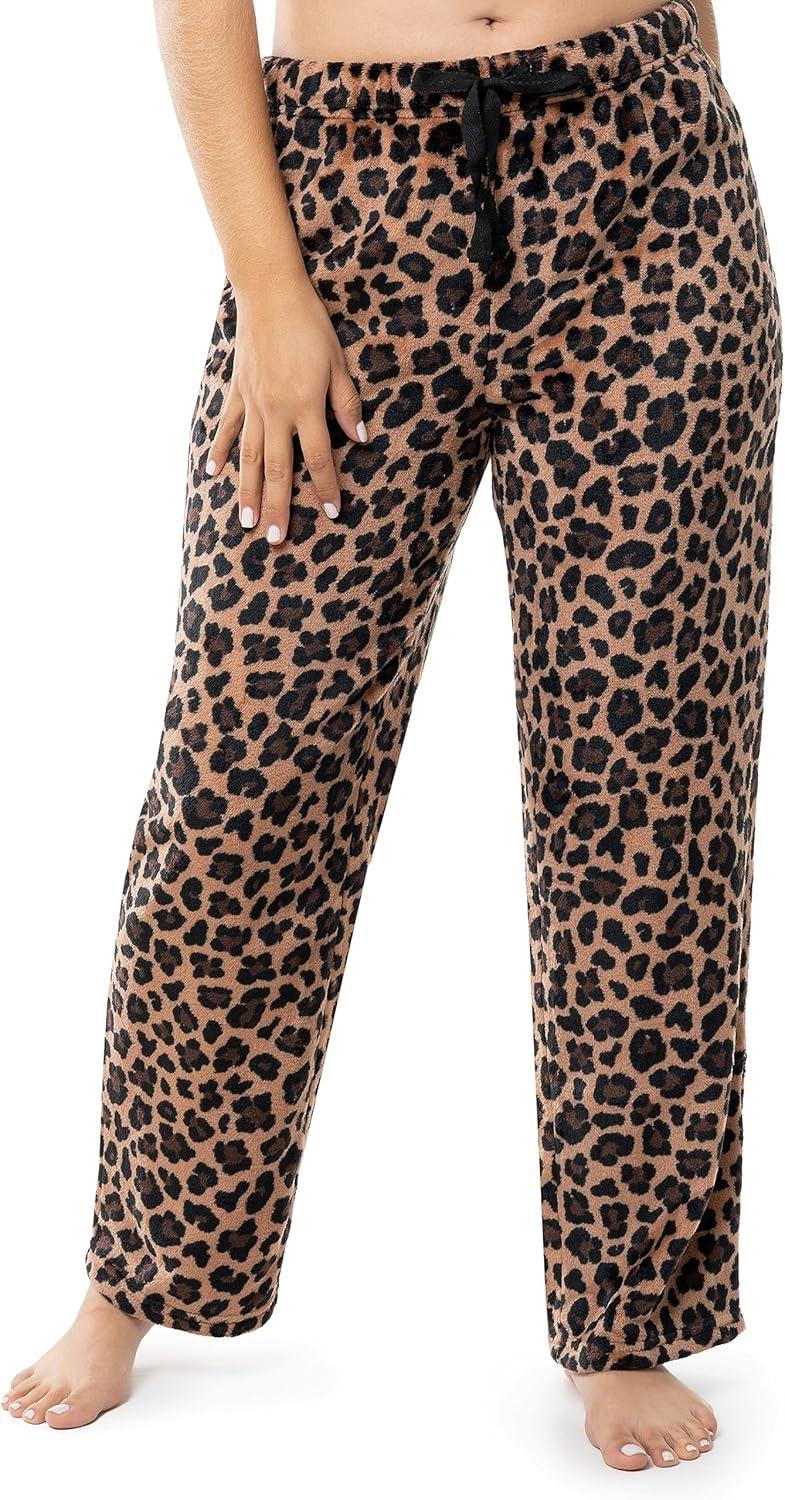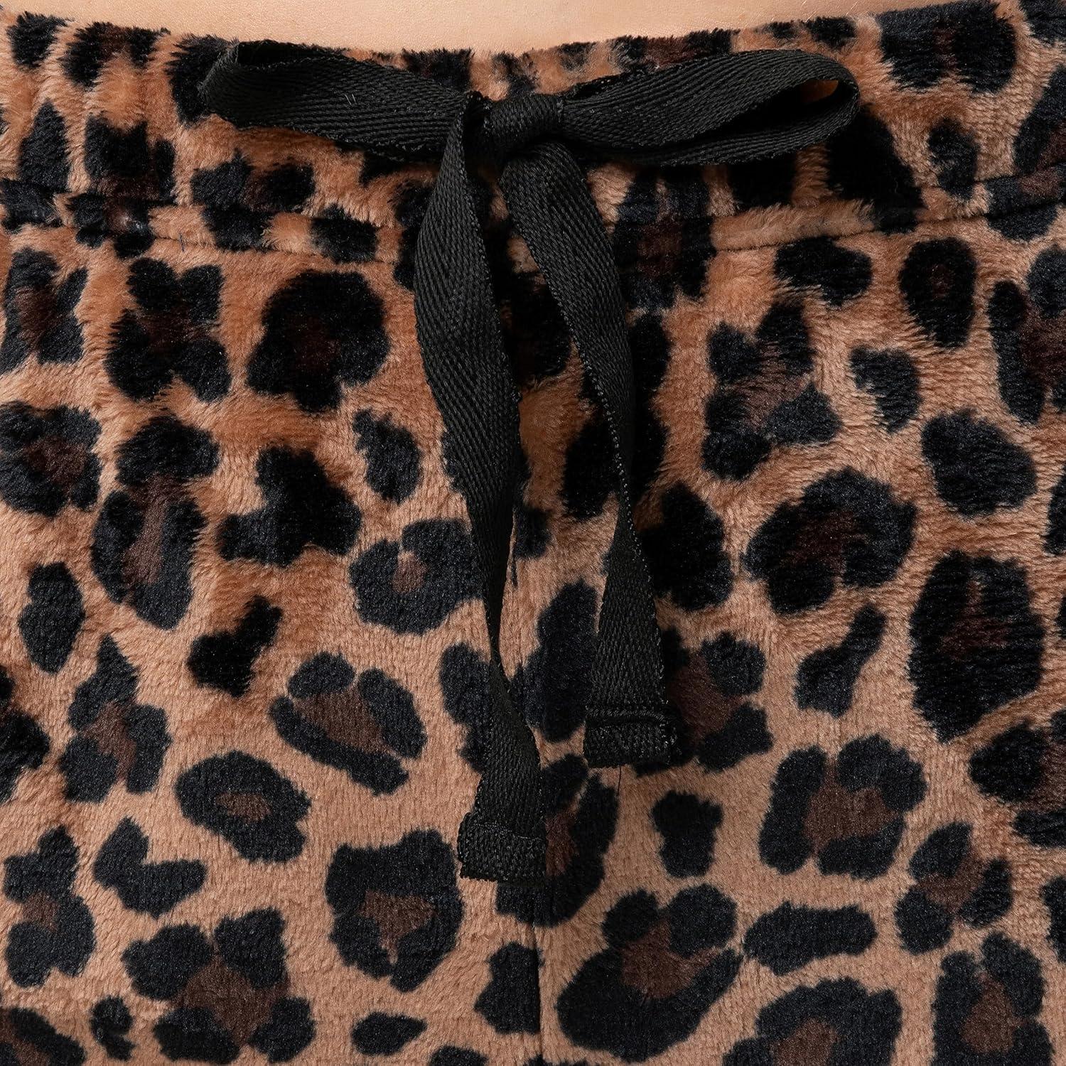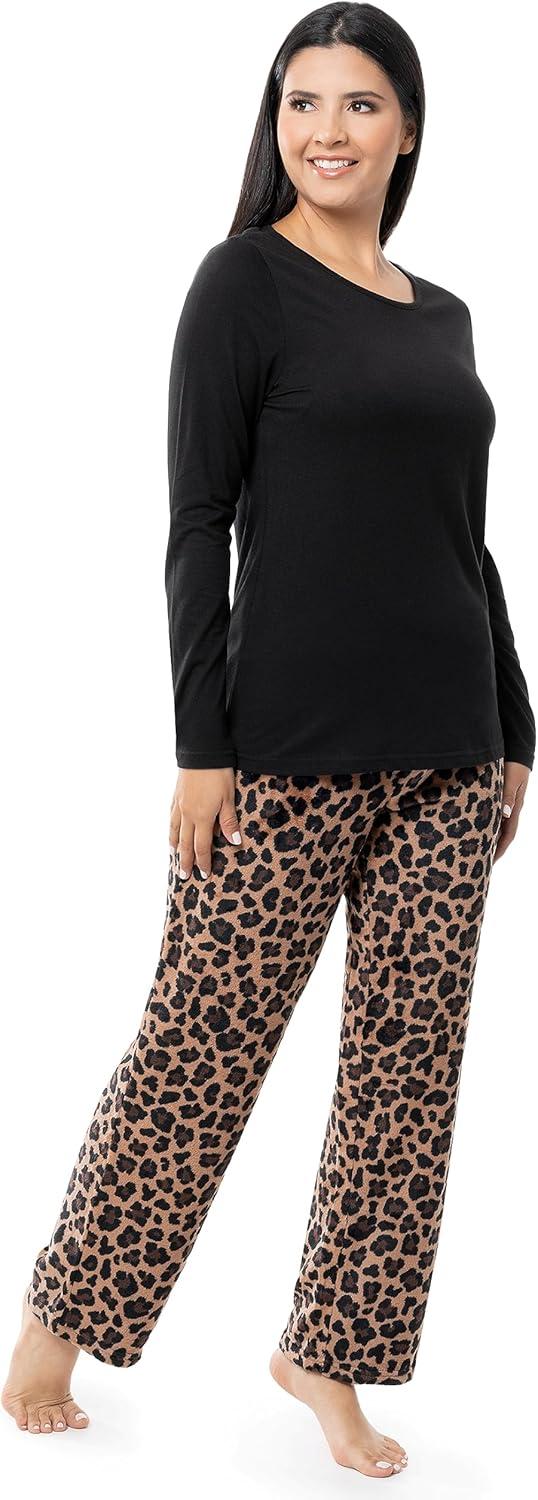 Fruit of the Loom Women’s Sueded Jersey Crew Top and Fleece Pant Sleep Set(Black/Cheetah Print)