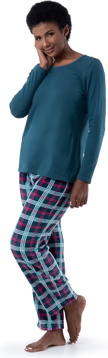 Fruit of the Loom Women's Sueded Jersey Crew Top and Fleece Pant Sleep Set(Midnight Blue/Tartan Plaid)