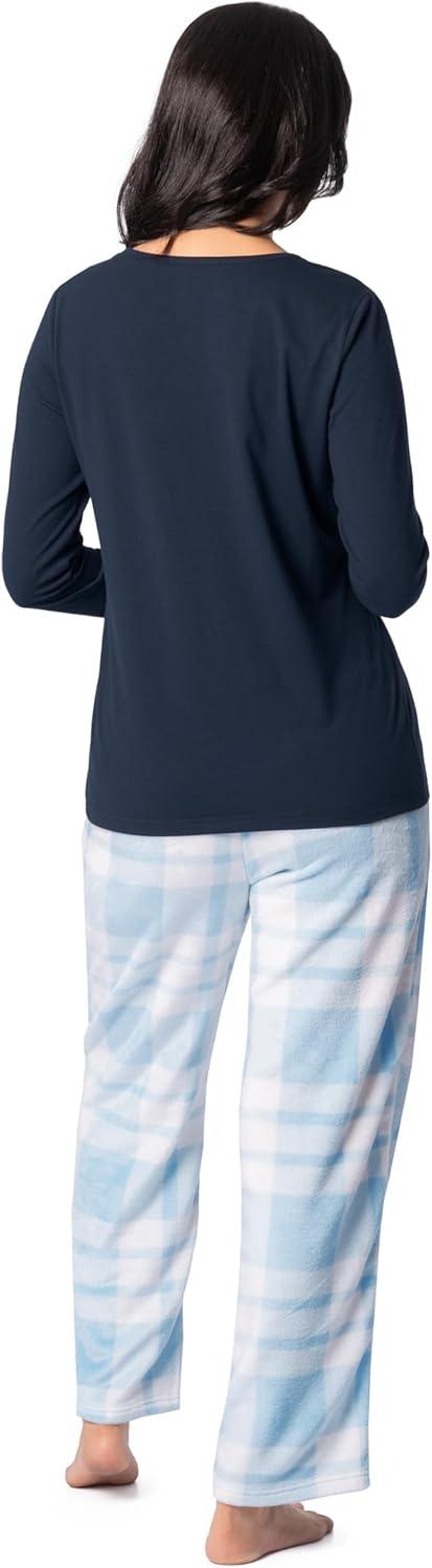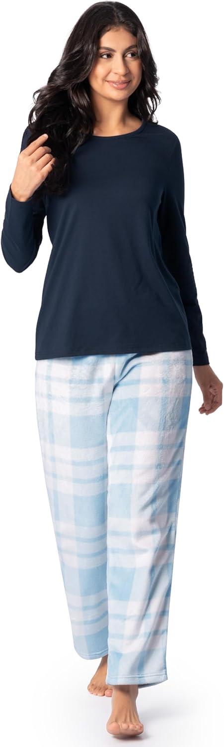 Fruit of the Loom Women's Sueded Jersey Crew Top and Fleece Pant Sleep Set(Navy/Snow Plaid)