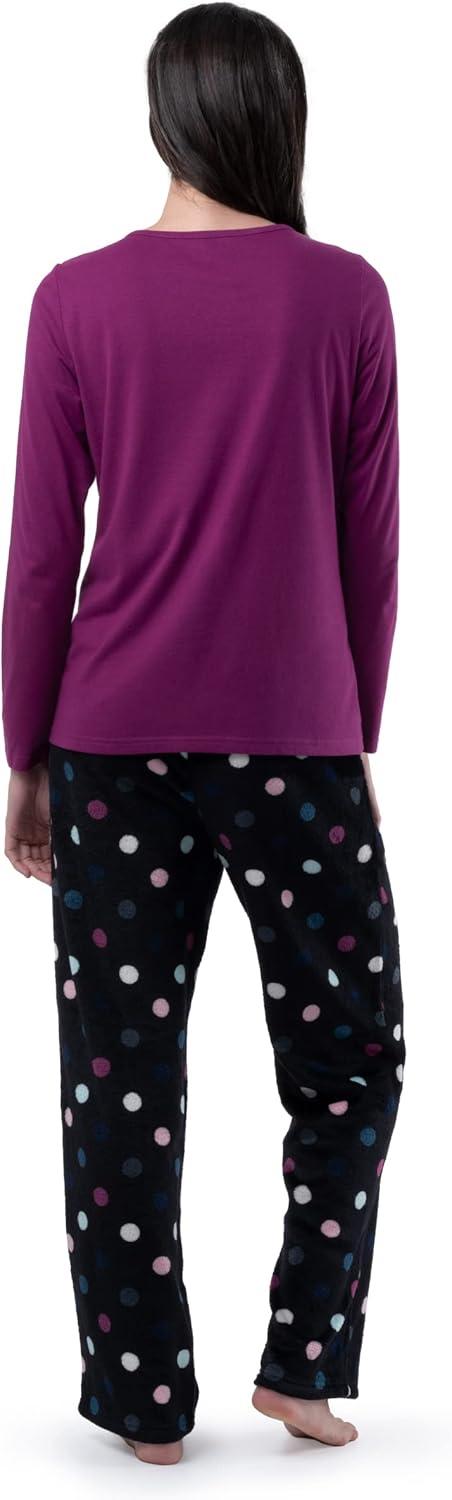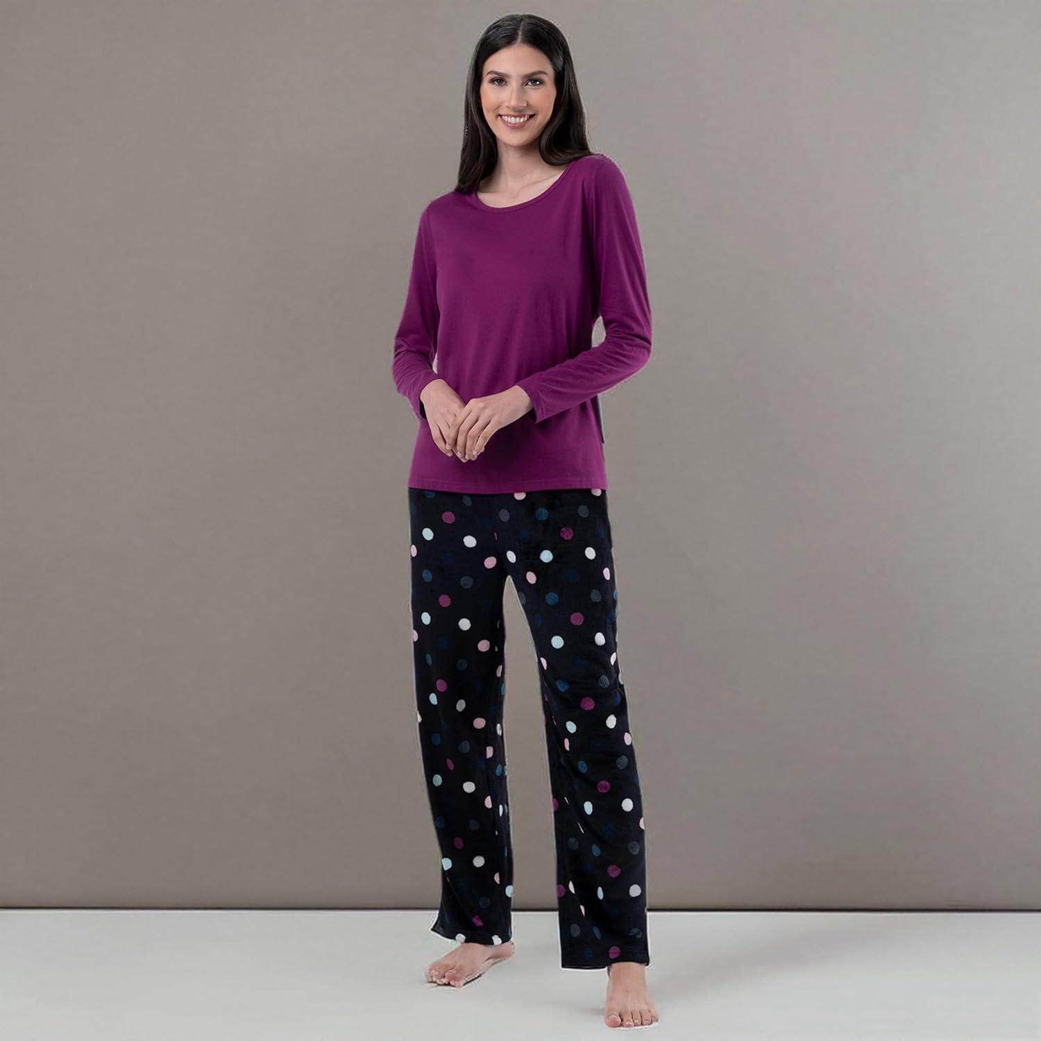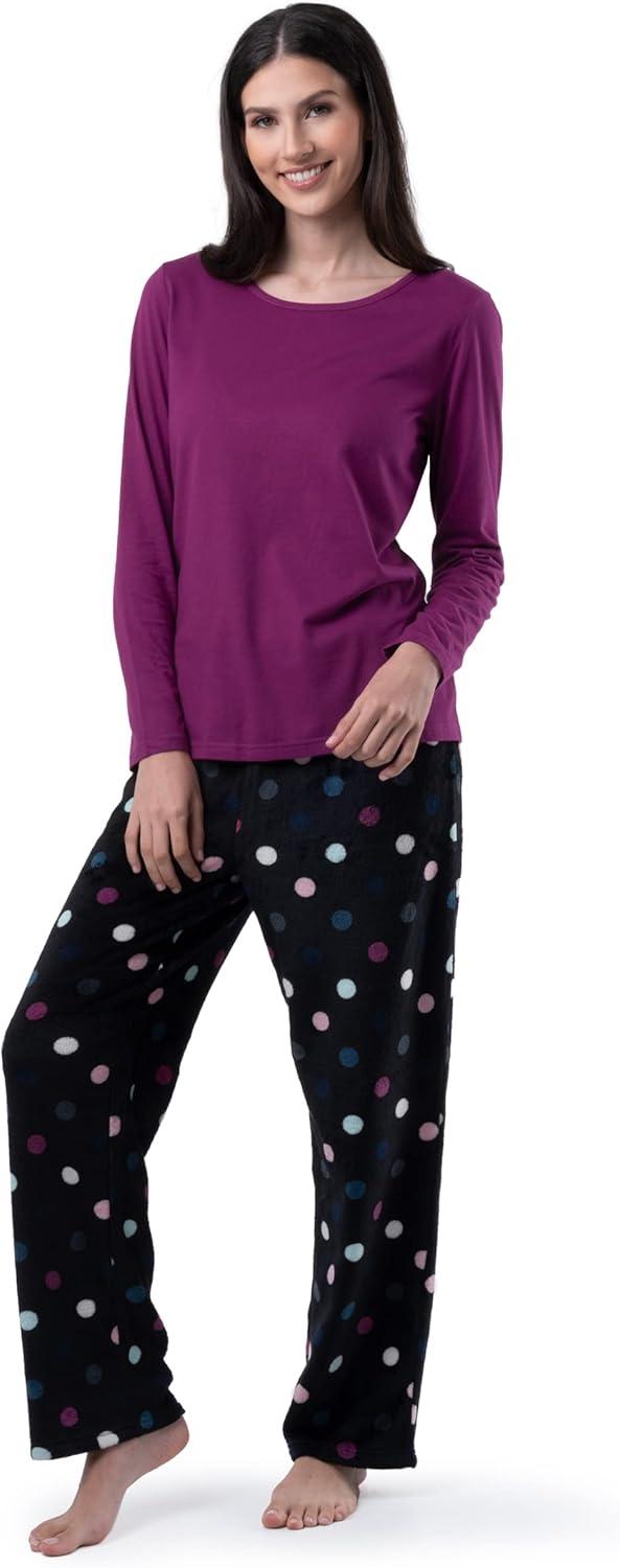 After a long day, there are few better feelings than taking off your work or day clothes and slipping into your favorite snuggly pajama set. This Women’s Fruit of the Loom BeyondSoft V-neck and Flannel Pant Sleepwear Set will keep you warm and comfy after your long day and still have you looking chic! The long-sleeve top made from extra-soft jersey fabric feels soft against the skin, providing just enough warmth and comfort without being overly bulky. The crew-neck collar gives it a classic look for those who prefer a little extra comfort around the neckline. Paired with a cozy fleece sleep pant with a relaxed fit, covered elastic waistband, and drawcord for a snug fit when you need it makes this a great PJ for sleep and those binge-worthy weekends at home. These PJs are all about comfort, but that doesn’t mean you have to scarify your style; with various shirt colors available and matching printed pants featuring fun and winter-themed patterns, you’ll look as chic as ever. Give your wardrobe an update this winter with this Women’s Fruit of the Loom BeyondSoft Crew-neck and Fleece Pant Sleepwear Set.