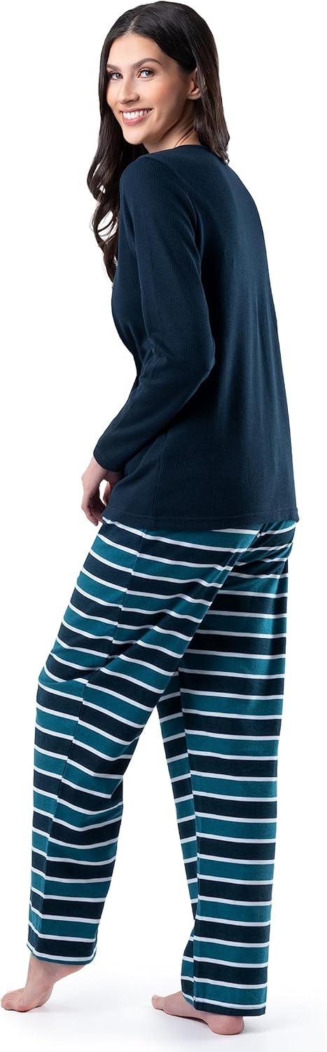 Fruit of the Loom Women’s Waffle V-Neck Top and Flannel Pant Sleep Set(Midnight Blue/Blue Sea Stripe)