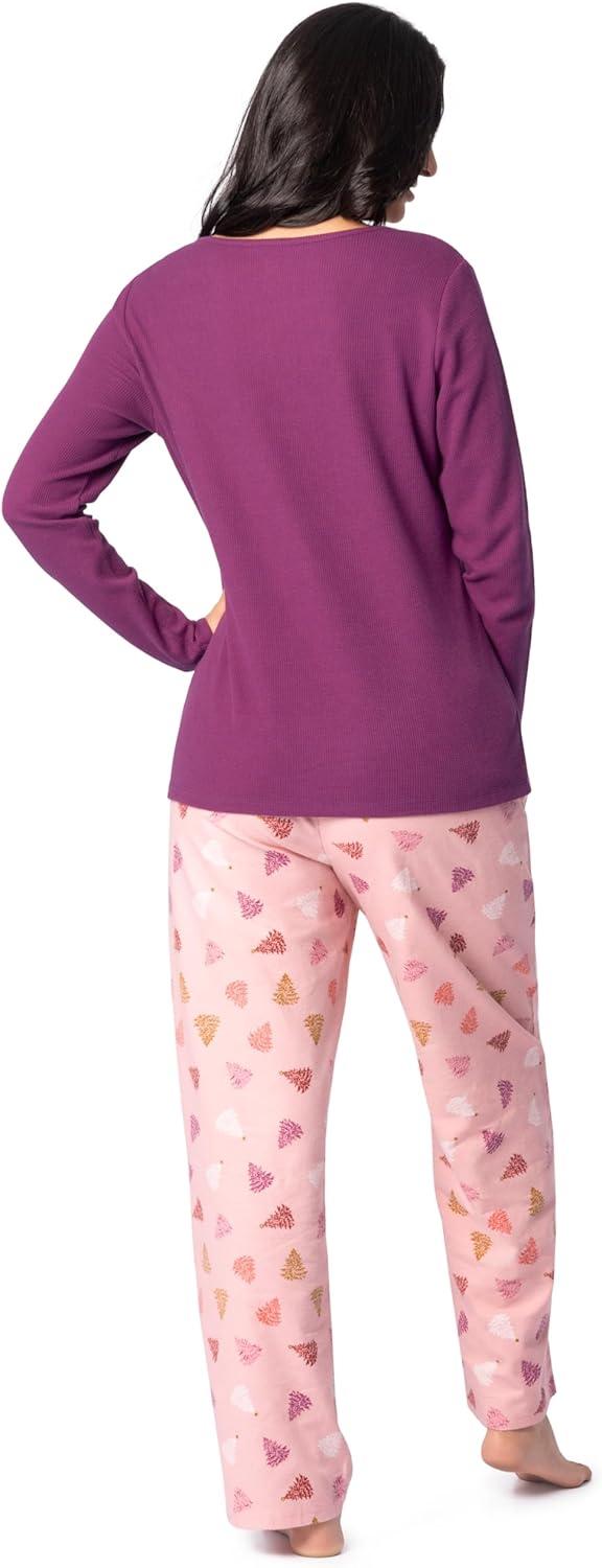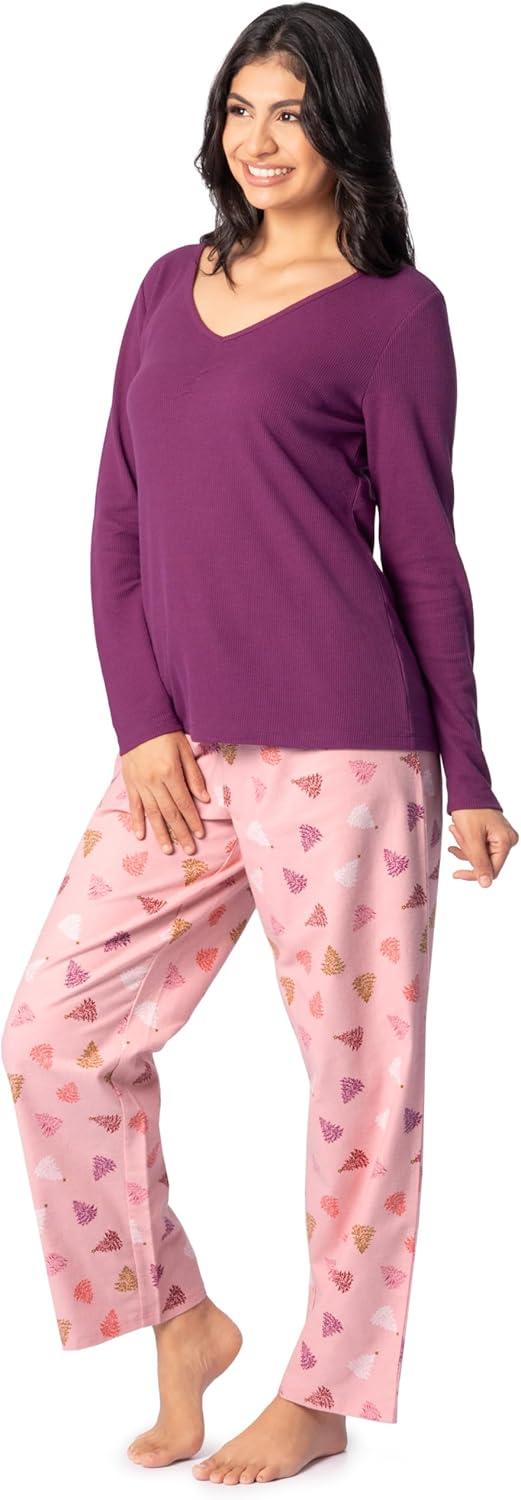 Fruit of the Loom Women’s Waffle V-Neck Top and Flannel Pant Sleep Set(Purple/Fluffy Trees)